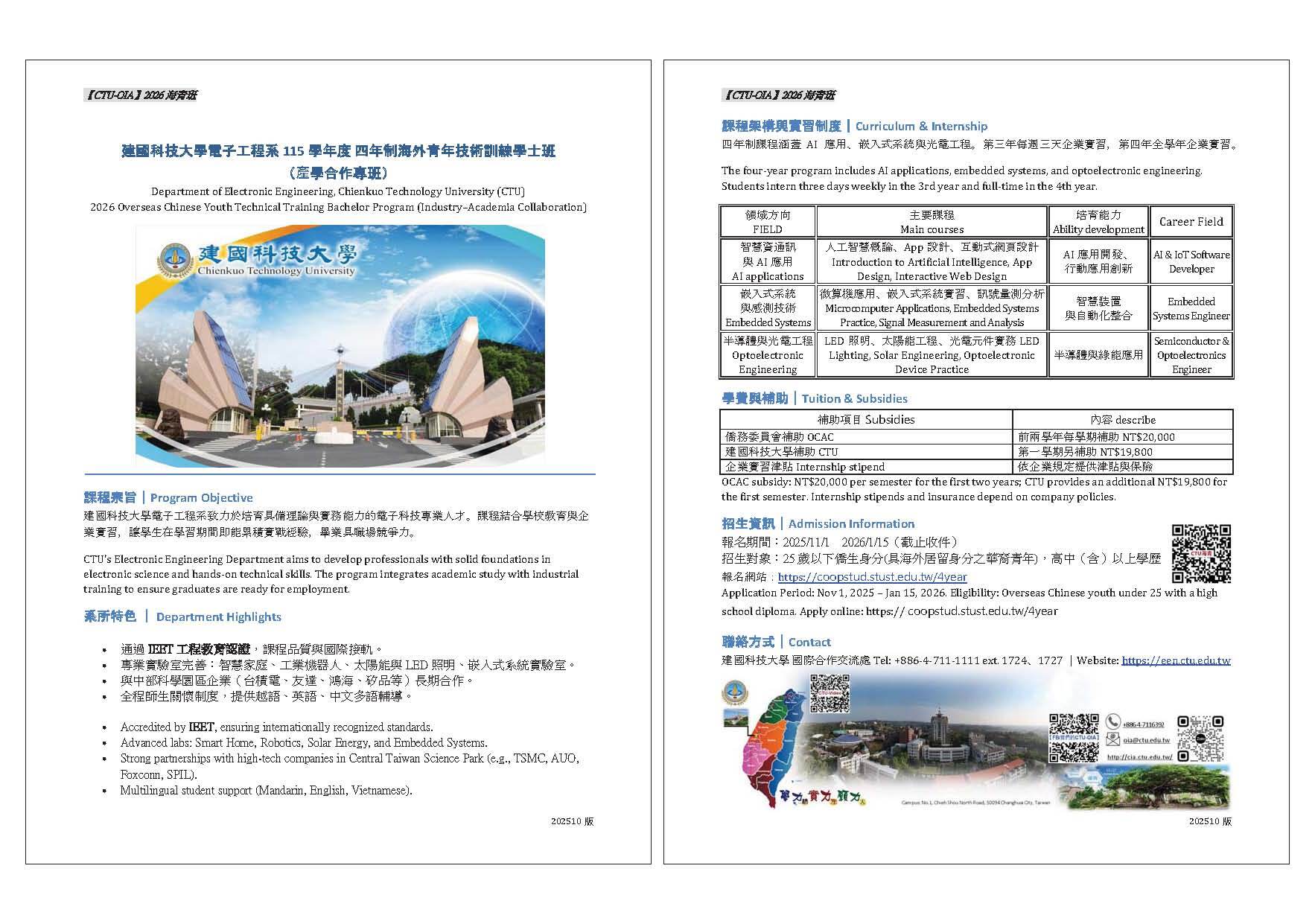115學年度(西元2026年)四年制產學合作學士海外青年技術訓練班 2026 Overseas Chinese Youth Technical Training Bachelor Program (Industry–Academia Collaboration) |